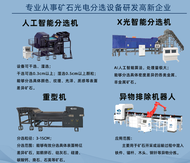 本次大會(huì)名德光電作為展商,展位位于E3展廳B175號(hào),分別帶來(lái)了四款礦用設(shè)備,分別為異物排除機(jī)器人、重型機(jī)、人工智能分選機(jī)和X光智能分選機(jī),涉及到礦石開(kāi)采或運(yùn)輸過(guò)程中混入的異物分揀,以及開(kāi)采后礦石分選兩大重要工序的產(chǎn)品。