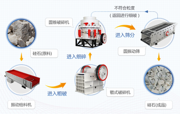 首先,硅石加工第一步是破碎工序。常見破碎設(shè)備有顎式破碎機(jī)、圓錐破碎機(jī)、沖擊式破碎機(jī)。通過破碎機(jī)將硅石破碎至適合顆粒大小,然后進(jìn)行至下一步加工工序。