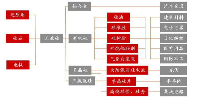 工業(yè)硅的下游應(yīng)用廣泛,按行業(yè)應(yīng)用產(chǎn)品可細(xì)分為多晶硅、有機(jī)硅和合金硅;其中,多晶硅又可以進(jìn)一步冶煉成單晶硅。多晶硅(單晶硅)多應(yīng)用于光伏產(chǎn)業(yè)和半導(dǎo)體產(chǎn)業(yè),合金硅主要應(yīng)用于汽車制造產(chǎn)業(yè);而有機(jī)硅不斷應(yīng)用于傳統(tǒng)行業(yè)(醫(yī)療器械、電子器件),還應(yīng)用于新興產(chǎn)業(yè)像是5G基站等。