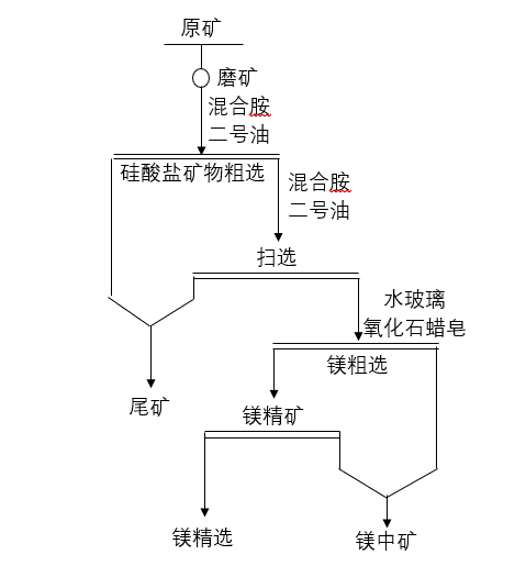 浮選法:菱鎂礦中雜質(zhì)主要分為硅酸鹽和碳酸鹽兩類。根據(jù)不同的雜質(zhì)類型,確定相應(yīng)的浮選流程。當(dāng)菱鎂礦中的脈石礦物主要是硅酸鹽類時,在自然PH條件下添加胺類陽離子捕收劑和起泡劑,可以實現(xiàn)良好的浮選效果。
