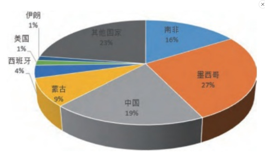 螢石礦資源在全球分布較廣,但主要集中在少數(shù)幾個國家。按探明儲量排序,南非、中國和墨西哥是全球螢石礦資源最為豐富的國家。此外,蒙古、西班牙、肯尼亞、美國、伊朗、摩洛哥等國也有一定量的螢石礦資源。