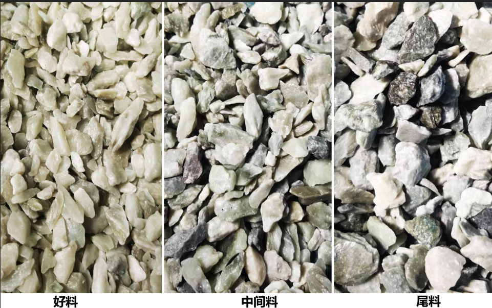 在介紹過整個廠區(qū)和產品后,帶著他們一行人來到我們名德人工智能分選機旁,并針對他們帶來的三種顆粒大小的滑石,現(xiàn)場開袋分選。
