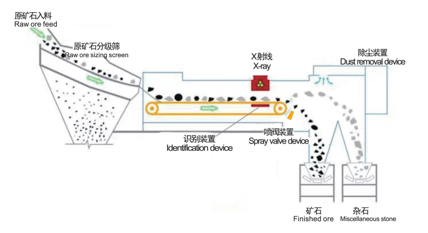 X光智能礦物分選機(jī)是利用X光射線對(duì)所選礦石進(jìn)行透射掃描,獲得礦石內(nèi)部所含礦物質(zhì)的原子序數(shù)數(shù)據(jù),通過(guò)卷積神經(jīng)網(wǎng)絡(luò)等手段對(duì)數(shù)據(jù)進(jìn)行處理,建立識(shí)別模型,識(shí)別出礦石與雜石,進(jìn)而驅(qū)動(dòng)執(zhí)行機(jī)構(gòu)進(jìn)行礦石分選。還可以根據(jù)礦石的不同特征,加裝可見(jiàn)光或紅外相機(jī),進(jìn)行復(fù)合識(shí)別,進(jìn)一步提高分選精度。