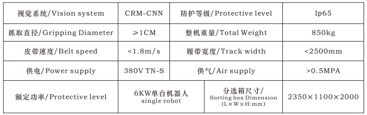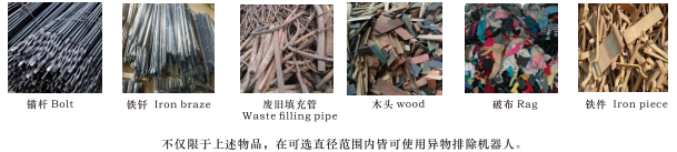 主要服務(wù)于礦石分選、礦石生產(chǎn)運輸流程中錨桿、鋼釬、破布、木頭、鐵件、廢舊充填管路等雜物分揀,代替人工手選、為減輕人員勞動力,降低設(shè)備故障率,減員增效奠定基礎(chǔ)。